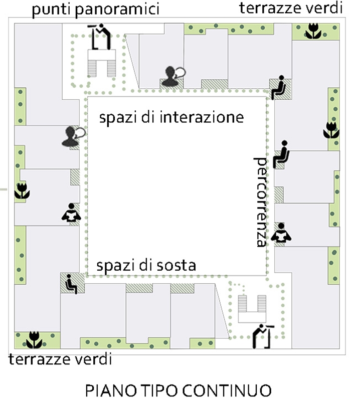 Le residenze, unico elemento persistente della città, rispondono ad una necessità odierna: avere la possibilità di scelta, un’alternativa al vivere nella città secondo modi e criteri imposti rigidamente e quasi sempre non adatti alle reali necessità dell’uomo contemporaneo. La varietà è garantita non solo grazie alla combinazione di diversi moduli abitativi studiati e dimensionati per le diverse esigenze, ma anche attraverso un modo di vivere che, diversamente dalla condizione introversa della città, è proiettata all’esterno in diretta continuità con il vuoto, elemento peculiare del progetto. Le unità abitative sono intrecciate tra loro secondo una varietà di 3 differenti tagli: small (60mq), medium (80mq) e large (140mq). I più piccoli pensati per single, giovani coppie e studenti riscoprono la forma dell’abitare minimo ed economico; i medi destinati alle piccole famiglie e giovani coppie ed infine i più grandi per le famiglie più numerose ed utenze più benestanti. Nello sforzo di disinnescare una successione di dicotomie pieno – vuoto, dinamico – statico, dentro-fuori, l’elemento di continuità è dato dallo spazio aperto: terrazze e balconi continui che scorrono ed abitano l’intero edificio diventano preminenti nella composizione degli ambienti dell’abitazione. Il sistema della corte, inoltre, offre la possibilità di un doppio affaccio differenziato: dal lato esterno il vuoto naturale e da quello interno il vuoto fortemente antropizzato della piazza. La dimensione domestica più intima si relaziona costantemente con lo spazio aperto a tal punto che è possibile quasi affermare che non vi è uno spazio propriamente chiuso ed introverso tipico dell’abitare nella città. Il verde entra negli edifici, è l’elemento costante, come una presenza regolare capace di generare nuove dinamiche spaziali e di fruizione sia nella dimensione privata dell’abitazione sia in quella comunitaria del tetto giardino.