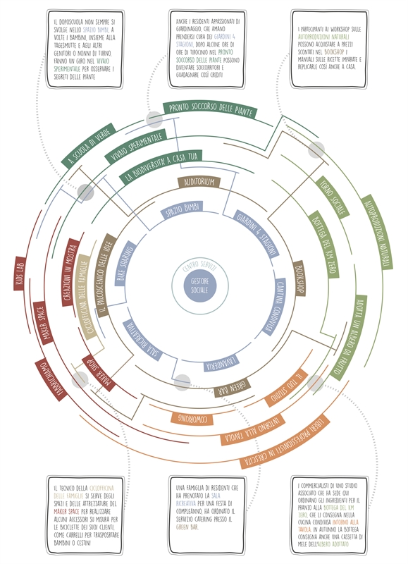 I servizi di Seminare futuro non vivono isolati l’uno dall’altro ma sono legati da connessioni che da una parte sono facilitate dal centro servizi (che funge da infopoint e tiene a sistema le attività dell’area), dall’altra nascono spontaneamente dall’utilizzo che gli utenti fanno degli spazi e anche dalle relazioni personali che si instaurano. Le officine, come i servizi della piazza dell’innovazione, sono affidate a enti terzi (associazioni, cooperative o imprese) già esistenti o che si costituiscono in funzione di questo progetto e che partecipano alla cooperativa contribuendo così ai costi di costruzione per la quota dei servizi.