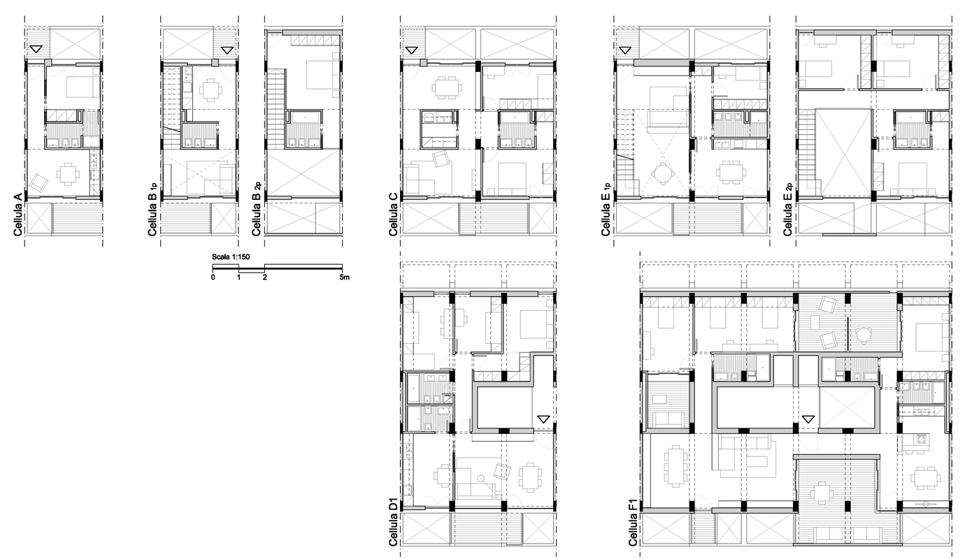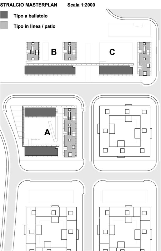 I due manufatti a ballatoio hanno rispettivamente tre e quattro livelli di residenze e in quanto aggregazioni seriali di cellule, consentono, per loro natura, l’associazione di alloggi di diversa pezzatura. Il manufatto in linea prevede tre piani di alloggi dei quali l’ultimo presenta delle case a patio. Per la testa meridionale del manufatto si prevedono alloggi speciali con affaccio esclusivo verso sud.