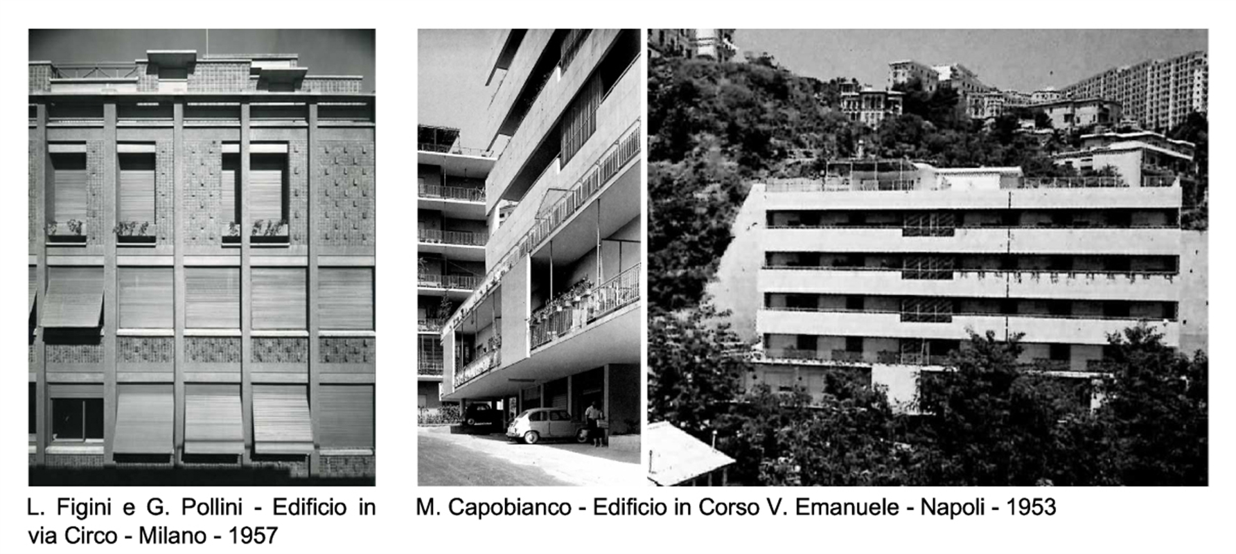 Il carattere del fronte est del manufatto in linea viene invece costruito a partire dall’interazione tra il dato costruttivo e il sistema delle bucature come frequentemente accade nel lavoro di diversi autori del razionalismo italiano, quali ad esempio Figini e Pollini che nell’edificio di Via del Circo (Milano) del 1953 arrivano addirittura al conflitto tra i due sistemi. Nel nostro caso la messa in evidenza dei solai e delle teste delle travi che evocano, come in una sorta di memoria archeologica, gli sporti del fronte occidentale privati dei mensoloni, si associa con la ricorrenza della finestra romana che sottolinea l’organizzazione seriale delle camere da letto.
